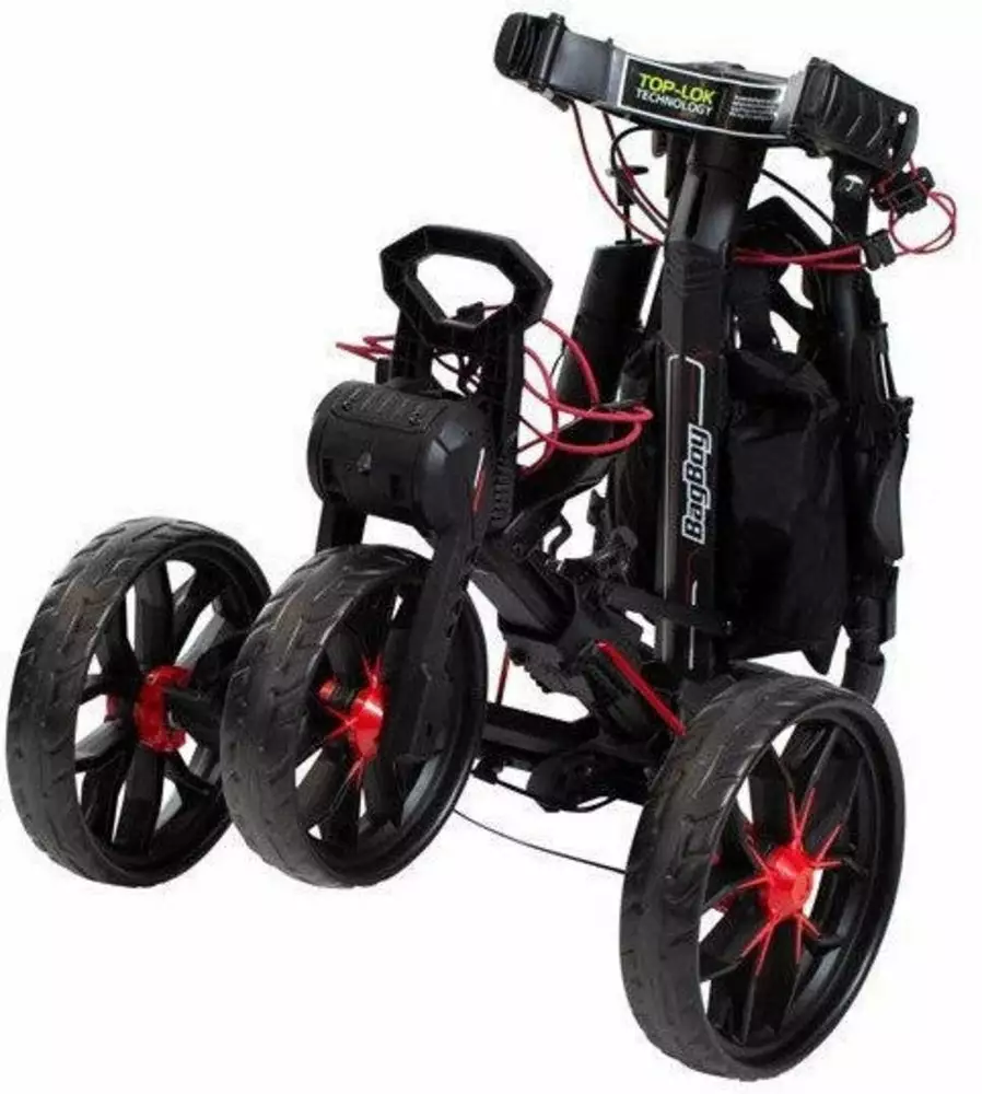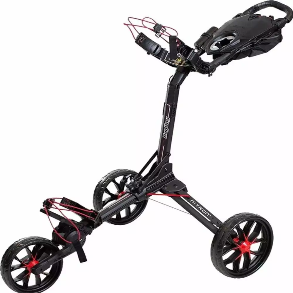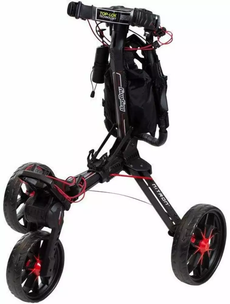 The Bagboy Auto Open Nitron Push Cart, a revolutionary auto open cart engineered with Nitro Piston Technology a patented nitrogen powered auto assist open mechanism.