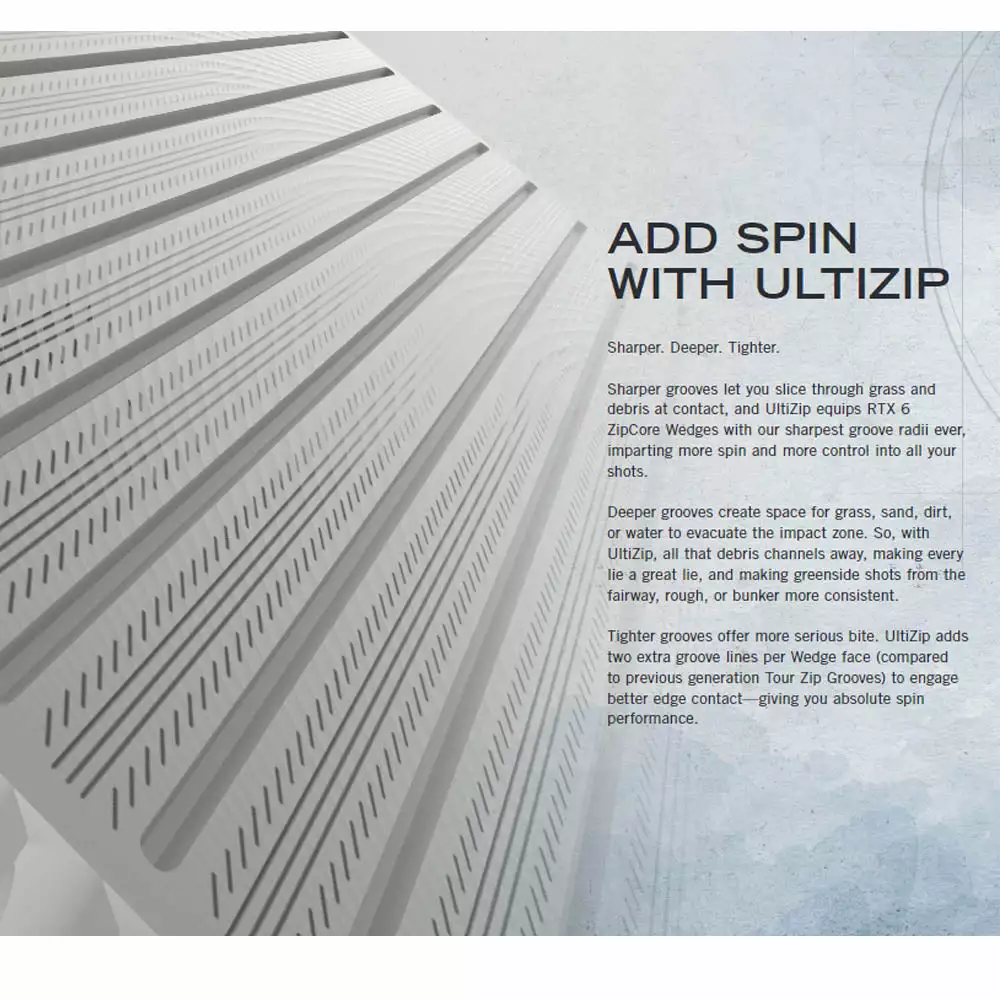 UltiZip – UltiZip features grooves, that are sharper, deeper and more tightly spaced. They slice through debris and bite harder for enhanced spin and control; channel more debris for better shot consistency; and are set closer together (compared to past Tour Zip Groove designs) so we can fit two more on the face for greater edge contact and absolute spin performance.