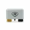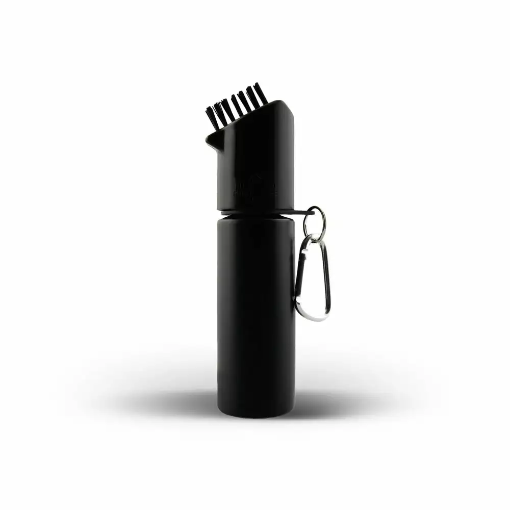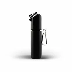 Unscrew the top and fill the bottle with water. After replacing the top, simply pull it upwards until you hear a ‘click’ and scrub the club with the nylon brush facing downward whilst at the same time squeezing the bottle enabling the water inside to flow through. The water bottle club cleaner also features a clip allowing it to be hung on a golf bag.
