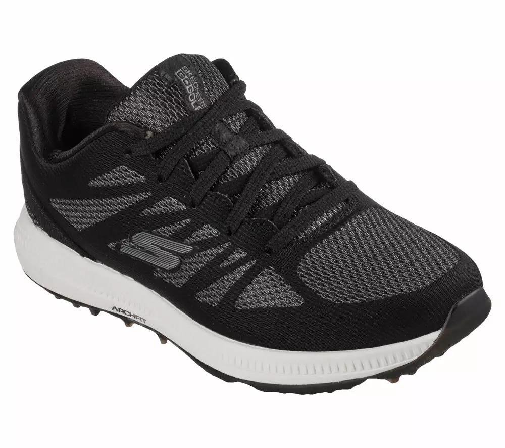 Take the course in supportive comfort and sleek athletic style with Skechers GO GOLF Elite 5. This lace-up golf design features a waterproof mesh and synthetic upper with a removable Arch Fit insole and GRIPFLEX spikeless traction outsole.