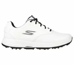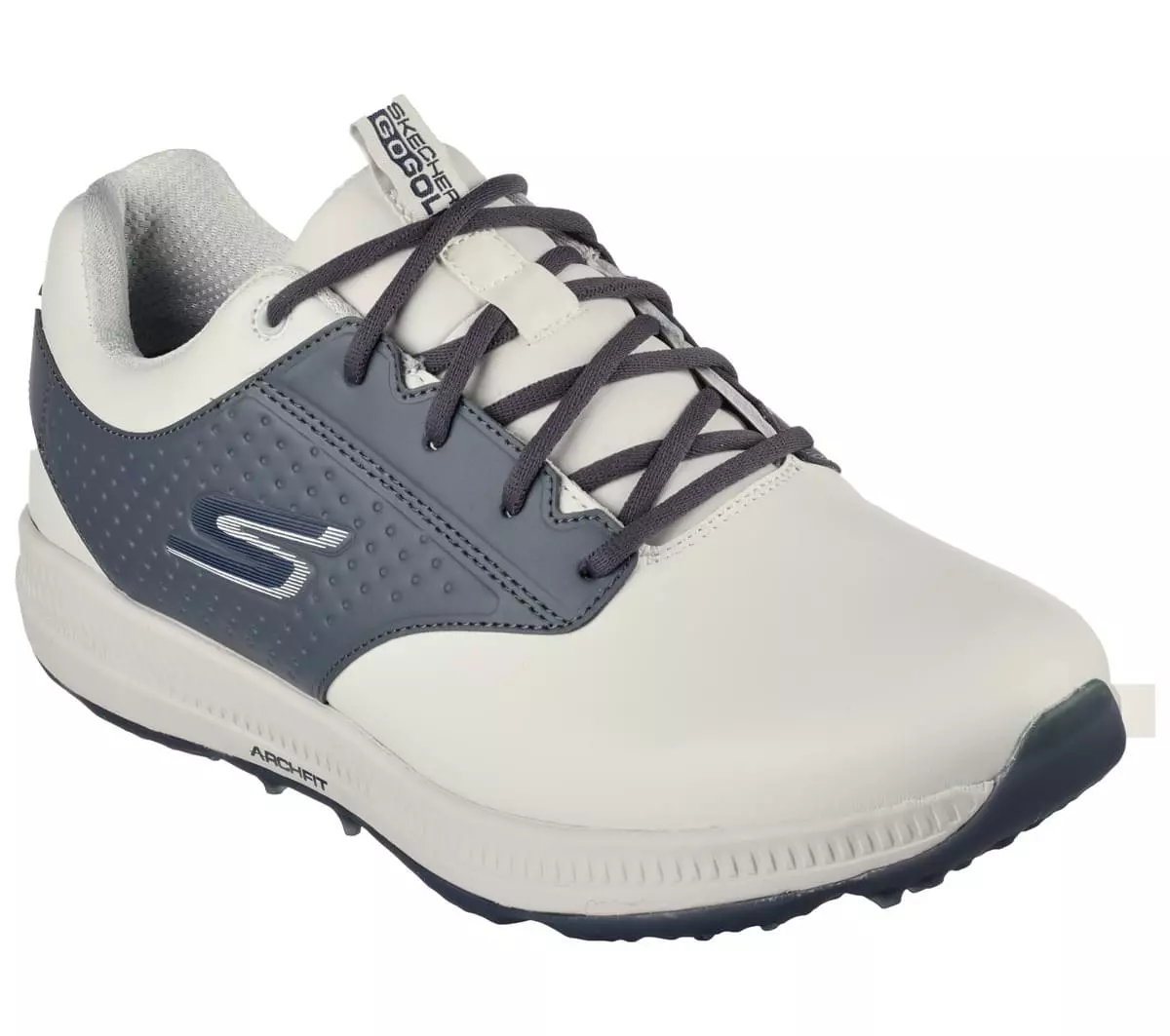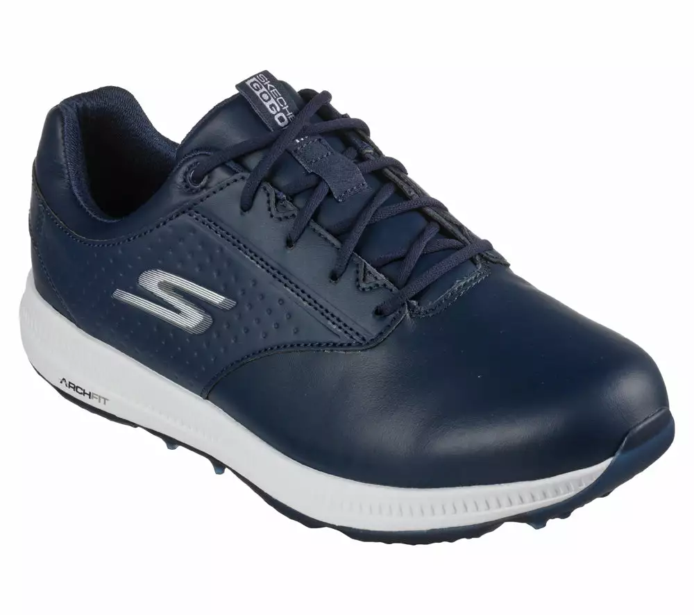 Put on your best game in supportive comfort with Skechers GO GOLF Elite 5 – Legend. This lace-up golf design features a waterproof leather upper with a removable Arch Fit comfort insole and a spikeless traction outsole.