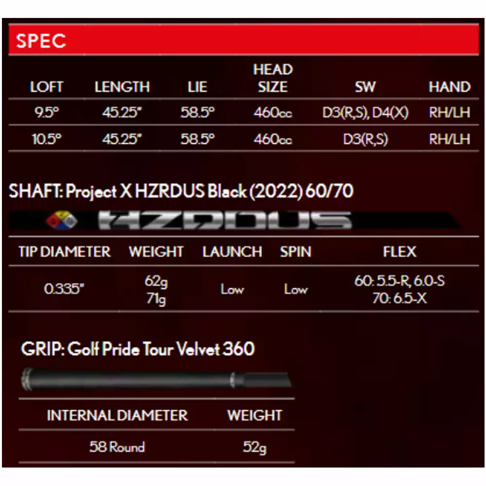 Driver as standard is fitted with a Hzrdus Black Graphite Shaft & Golf Pride Tour 360 Grip